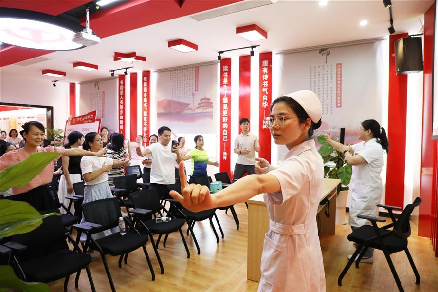 隨后,蔣芳幸醫(yī)生現(xiàn)場示范八段錦經(jīng)典動作,逐一講解要領(lǐng)及養(yǎng)生功效。職工們跟隨練習,在醫(yī)生指導(dǎo)下逐漸掌握動作規(guī)范,切身感受傳統(tǒng)功法的養(yǎng)生魅力。